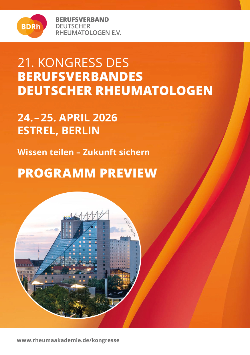 wir laden Sie herzlich zum 21. Jahreskongress des Berufsverbandes Deutscher Rheumatologen e. V. (BDRh) ein – erstmals im Estrel Berlin, mit neuen Möglichkeiten für Austausch, Vernetzung und Wissenstransfer.