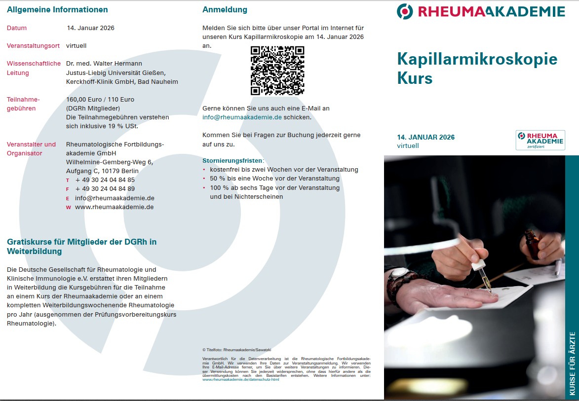 Der Kurs vermittelt theoretisches und praktisches Grundwissen zur Indikationsstellung und Durchführung der Kapillarmikroskopie sowie zur Interpretation der Untersuchungsergebnisse. Neben Normalbefunden sollen vor allem die typischen kapillarmikroskopischen Befunde bei der systemischen Sklerose sowie bei anderen Kollagenosen erlernt und deren Erkennung auch praktisch geübt werden. Zusätzlich werden aktuelle wissenschaftliche Hintergründe sowie weitere diagnostische Aspekte aus dem Gebiet der Mikroangiopathien erläutert.