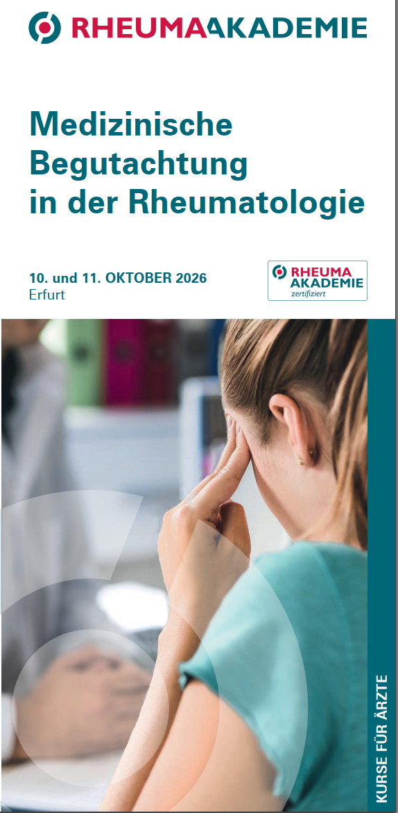 Dieser zweitägige Kurs „Medizinische Begutachtung in der Rheumatologie“ wurde als fachspezifisches Modul III Innere Medizin / Rheumatologie innerhalb des Curriculums „Medizinische Begutachtung“ von der Bundesärztekammer anerkannt.